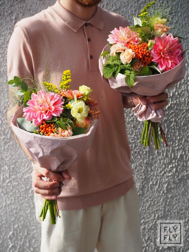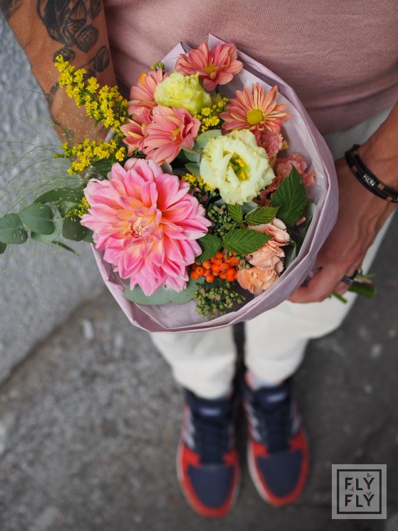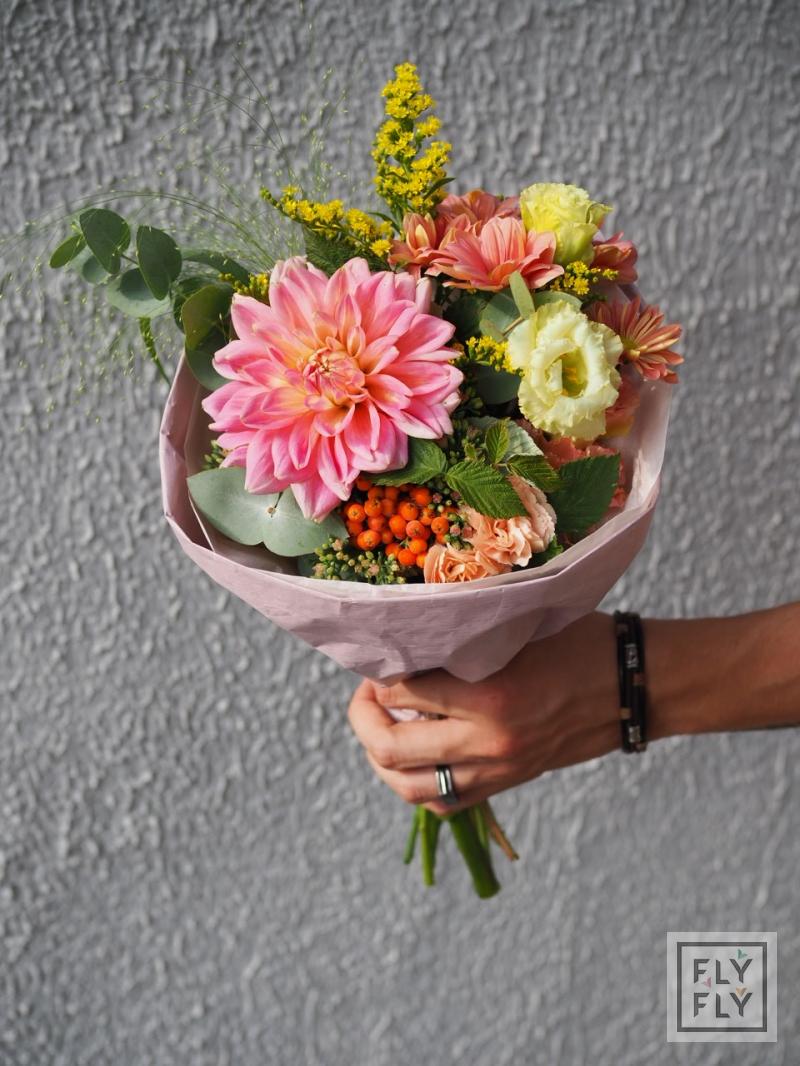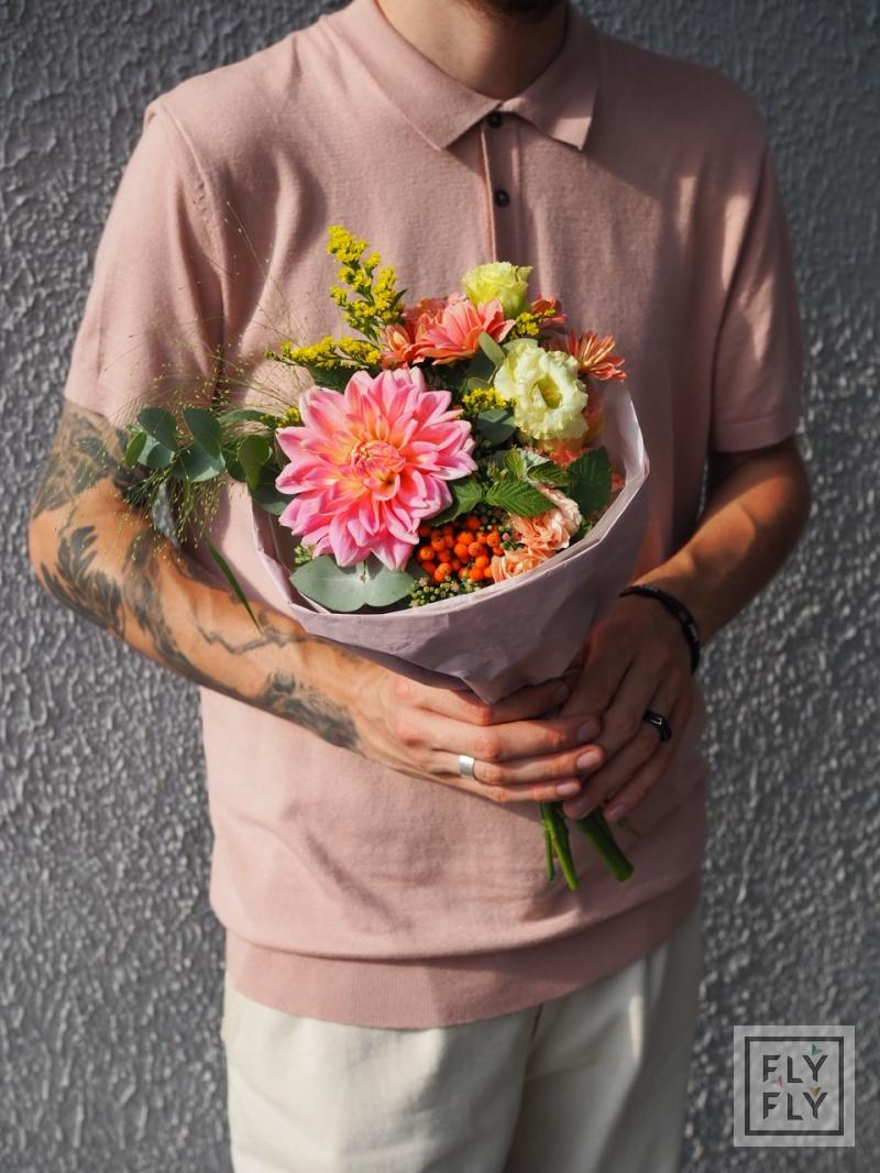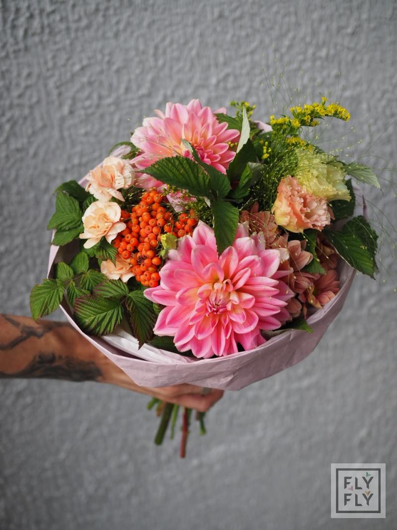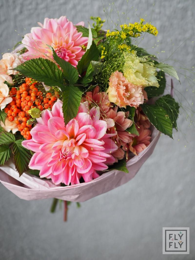 В составе: георгин, диантус, седум, хризантема кустовая, рябина, эустома, эвкалипт, солидаго, паникум и малина.
